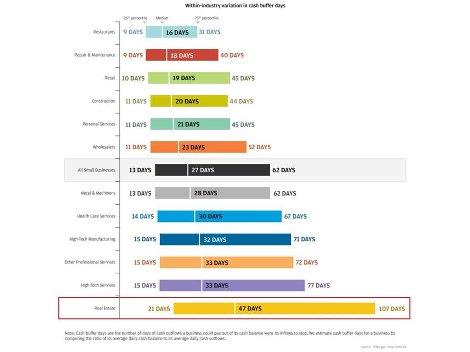 摩根大通曾對美國近60萬家企業的現金儲備做過研究分析,最能抵抗不景氣的產業就是房地產,現金緩衝天數達到107天。美國如此,世界各國亦然,疫情失控之下,房地產絕對是投資人最佳的避風港。